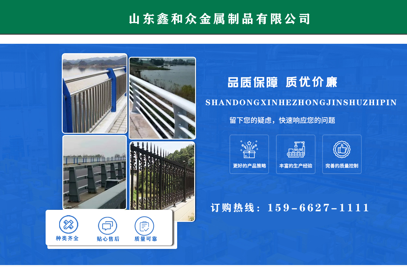 山東鑫和眾金屬制品有限公司主要產(chǎn)品有防撞護(hù)欄,橋梁護(hù)欄,道路護(hù)欄,河道護(hù)欄,不銹鋼護(hù)欄等護(hù)欄。提供設(shè)計(jì)方案,一站式定制,包您滿意價(jià)格優(yōu)惠,歡迎來(lái)電咨詢! 公司常年從事銷(xiāo)售護(hù)欄防撞護(hù)欄,橋梁護(hù)欄,道路護(hù)欄,河道護(hù)欄,不銹鋼護(hù)欄,橋梁鋼護(hù)欄,河道燈光護(hù)欄等。產(chǎn)品廣泛應(yīng)用于橋梁、河道、旅游景區(qū)、道路、公路、公園、小區(qū)、景觀、道路防撞等領(lǐng)域。 公司產(chǎn)品均采用優(yōu)質(zhì)不銹鋼材料,符合相關(guān)標(biāo)準(zhǔn)。各種型號(hào)不銹鋼復(fù)合管及護(hù)欄,質(zhì)量嚴(yán)格把控。產(chǎn)品強(qiáng)度高、耐腐蝕、焊接牢固、抗沖擊、性能好,防撞護(hù)欄結(jié)構(gòu)簡(jiǎn)單、美觀實(shí)用大方。 歡迎前來(lái)訂購(gòu)!...